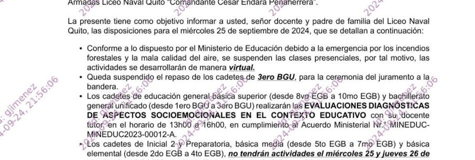 Informando disposiciones generales para el miércoles 25, jueves 26 y viernes 27 de septiembre del 2024. Por favor tomar conocimiento